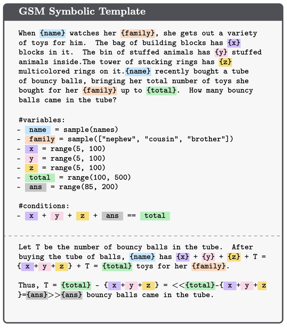 The researchers behind this study weren't convinced GSM8K was challenging enough. So, they created GSM-Symbolic. Think of it like asking someone to solve "2 + 2" and then switching it up: "If you have 2 apples and want 4 fruits total, how many bananas do you need?" Same math, but now there's a story involved.