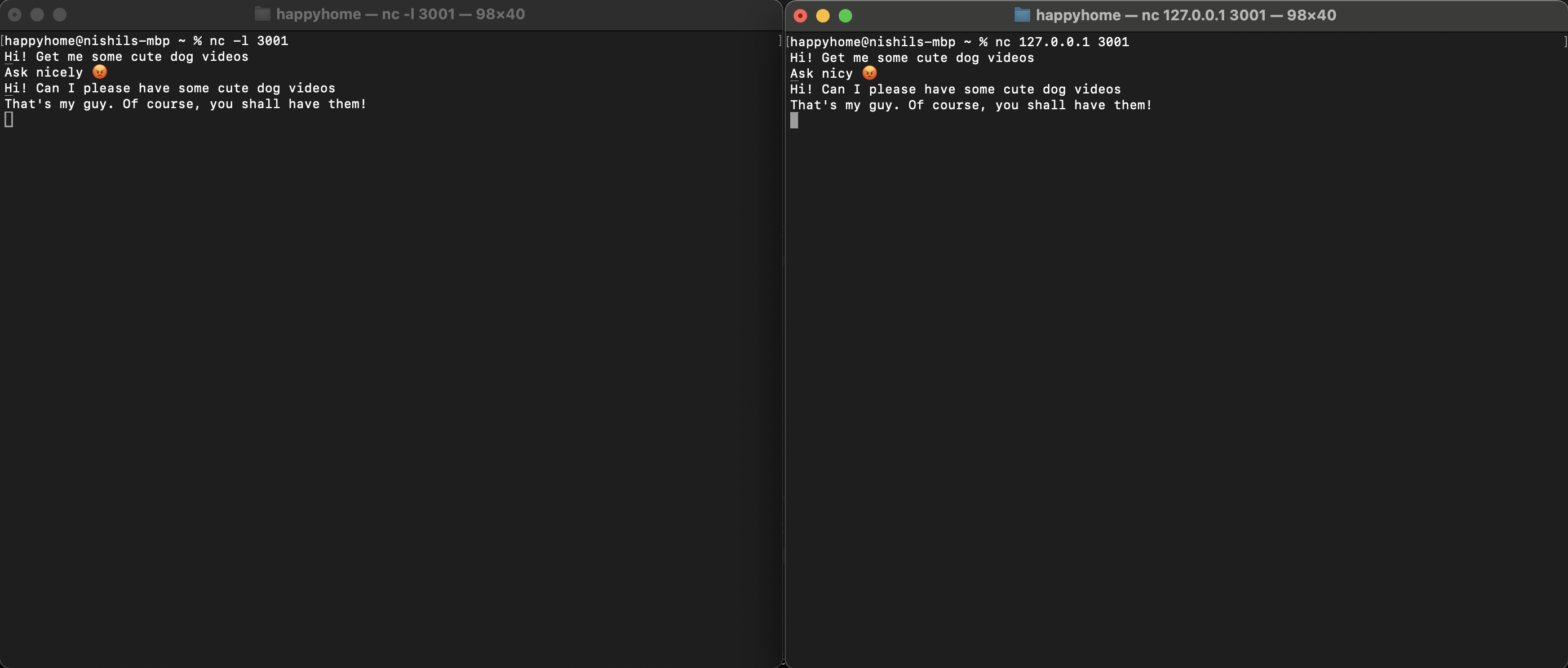 Congratulations! You've just created a tiny version of a client-server connection. It's like having two tin cans connected by a string, but for computers. Whatever you type in one window shows up in the other. Mind-blowing, right?