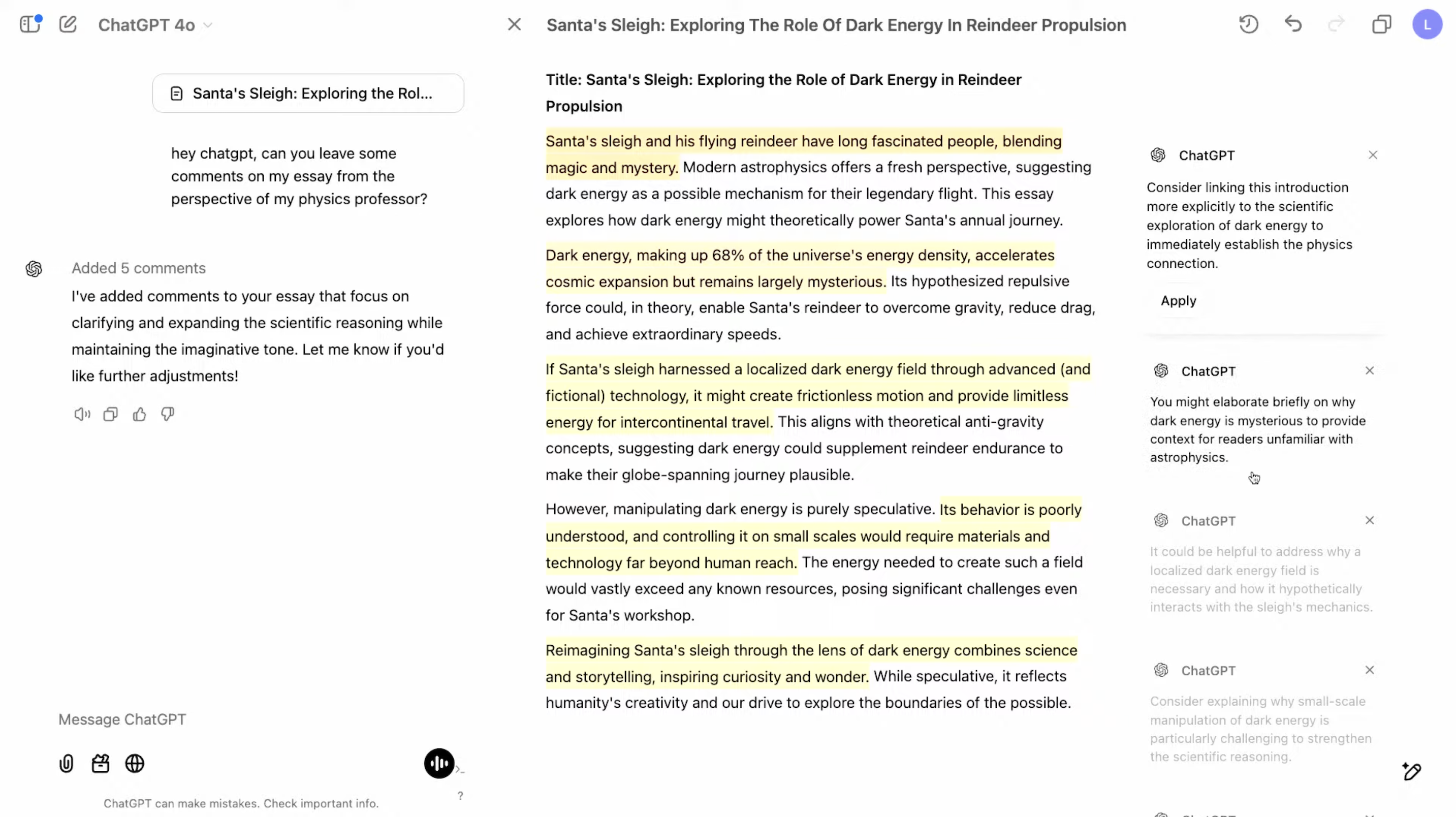 The holidays came early with video input capabilities and a festive 'Santa' persona. Now, you can interact with ChatGPT through videos and get holiday cheer without the mall lines. Ho ho ho!